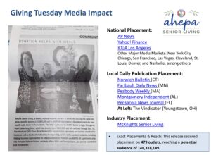 AHEPA Senior Living, a leading national nonprofit provider of affordable housing and aging services, delivered a $1,000 Giving Tuesday gift card to each of its independent living communities to provide community-wide meals for its residents. AHEPA Senior Living’s Emergency Food Fundraising Drive powered the initiative that raised $100,000. The drive continues through Dec. 31, 2025. Below is an overview of the media impact generated by the Giving Tuesday fundraising campaign. Thank you for your support!